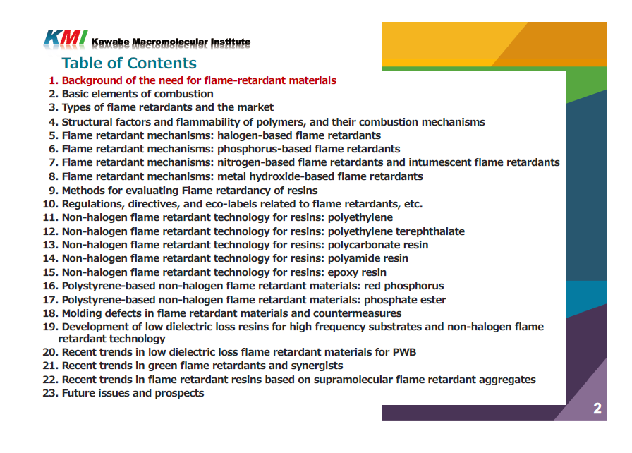 本次研討會將概述圍繞阻燃劑的各項法規動向、阻燃等級與阻燃性評估方法、高分子材料的燃燒機構、各類阻燃劑的抑燃機理、阻燃化時的配方設計與特性控制、成形加工過程中缺陷現象的對應措施,以及5G/6G時代高頻基板材料的阻燃化技術與環境友善型阻燃化技術等最新發展趨勢。